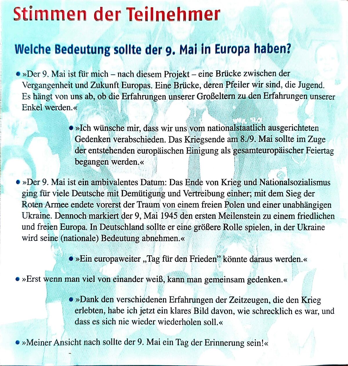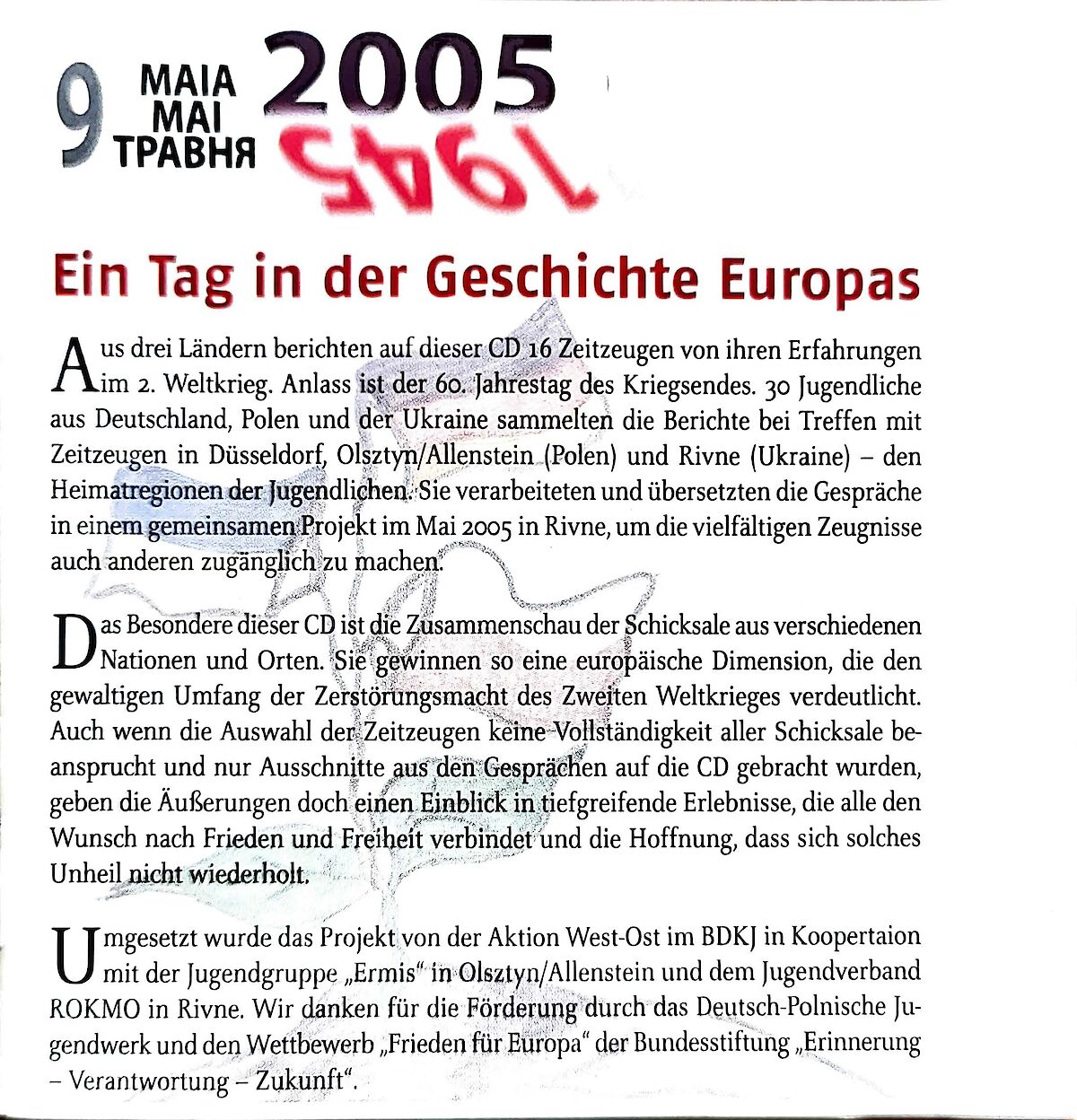 W 2005 roku dzień ten stał się okazją do zorganizowania projektu, w ramach którego trzydziestu młodym Niemcom, Polakom i Ukraińcom udało się przypomnieć sobie wydarzenia z 8 i 9 maja 1945 roku, poprzez wywiady ze świadkami tamtych wydarzeń. Zaproszono współczesnych świadków, którzy przeżyli koniec wojny jako zwycięzcy lub pokonani w różnych miejscach Europy, a oni opowiedzieli nam: Jak przeżyli koniec wojny? Co wydarzyło się w maju 1945 roku? Jak nastąpiło przejście od wojny do pokoju? Jak ludzie radzili sobie z codziennym życiem pod koniec wojny? Co o tym myślisz?