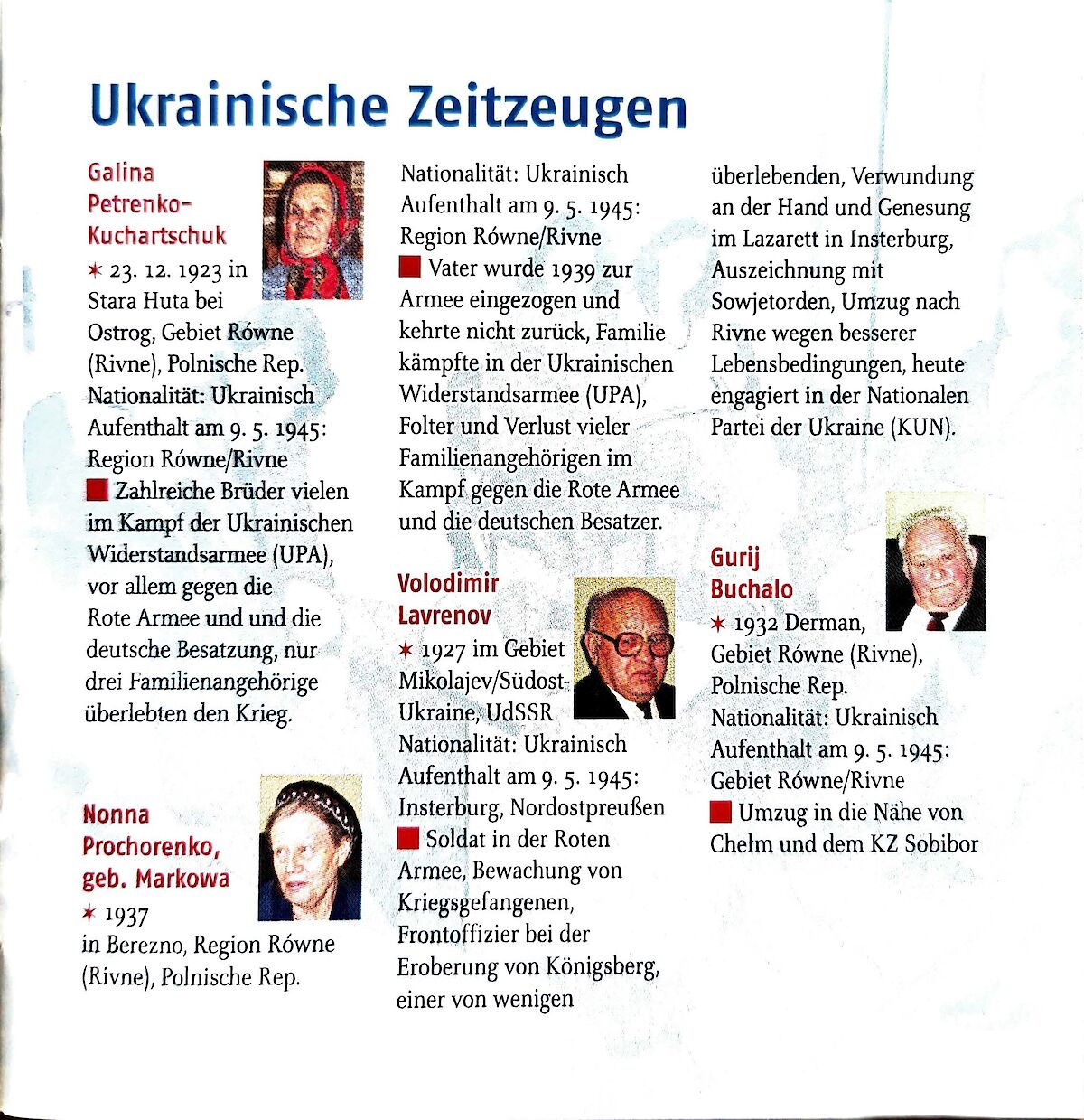 Współcześni świadkowie bardzo otwarcie opowiadali o swojej przeszłości, doświadczeniach i wspomnieniach: Rodziny dwójki współczesnych świadków walczyły w Ukraińska Powstańcza Armia (UPA) i straciły wielu członków rodziny w wyniku tortur, deportacji i egzekucji. Współczesny świadek opisał wrażenia ze swojego okresu służby w Armii Czerwonej; był oficerem frontowym podczas zdobywania Królewca. Czwarty świadek ze współczesnych miał wspomnienia m.in. dotyczące budowy obozu koncentracyjnego „Sobibór” w pobliżu swojego miejsca zamieszkania.