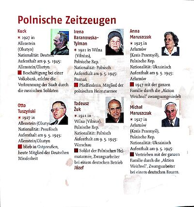 Projekt składał się z dwóch części: Pierwsza część składała się z dwóch weekendów, które spędzili niemieccy i polscy uczestnicy projektu w swoich krajach. W Olsztynie w Polsce przesłuchano sześciu współczesnych świadków o bardzo odmiennym pochodzeniu: Region, w którym leży Olsztyn, Warmia i Mazury, należał do Niemiec do końca wojny, a następnie został wcielony do Polski. Obecnie mieszkają tam ludzie o bardzo różnej historii i pochodzeniu. Współcześni świadkowie, którzy pochodzili z Wileńszczyzny, wówczas Polski, obecnie Litwy i byli członkami Armii Krajowej; Współcześni świadkowie, którzy pozostali w Polsce jako Niemcy, oraz współcześni świadkowie, którzy zostali przymusowo przesiedleni jako Ukraińcy w ramach „Akcji Wisła”.